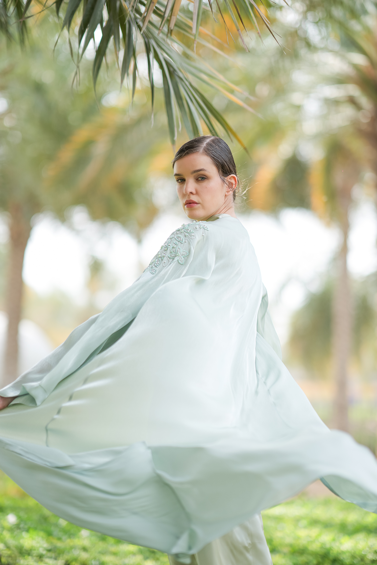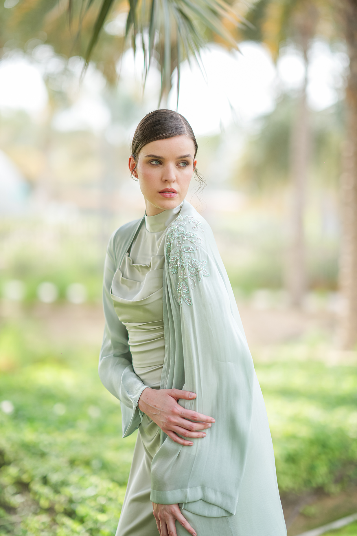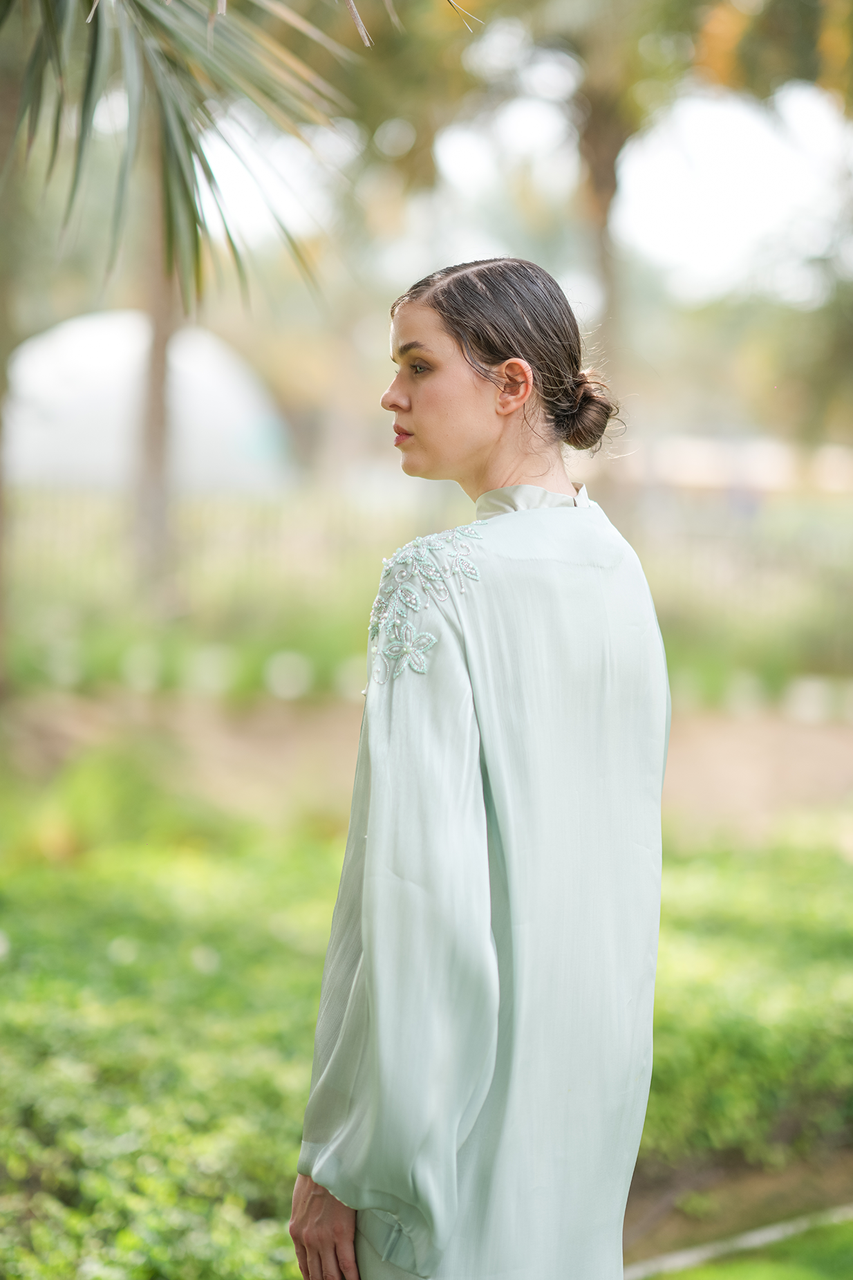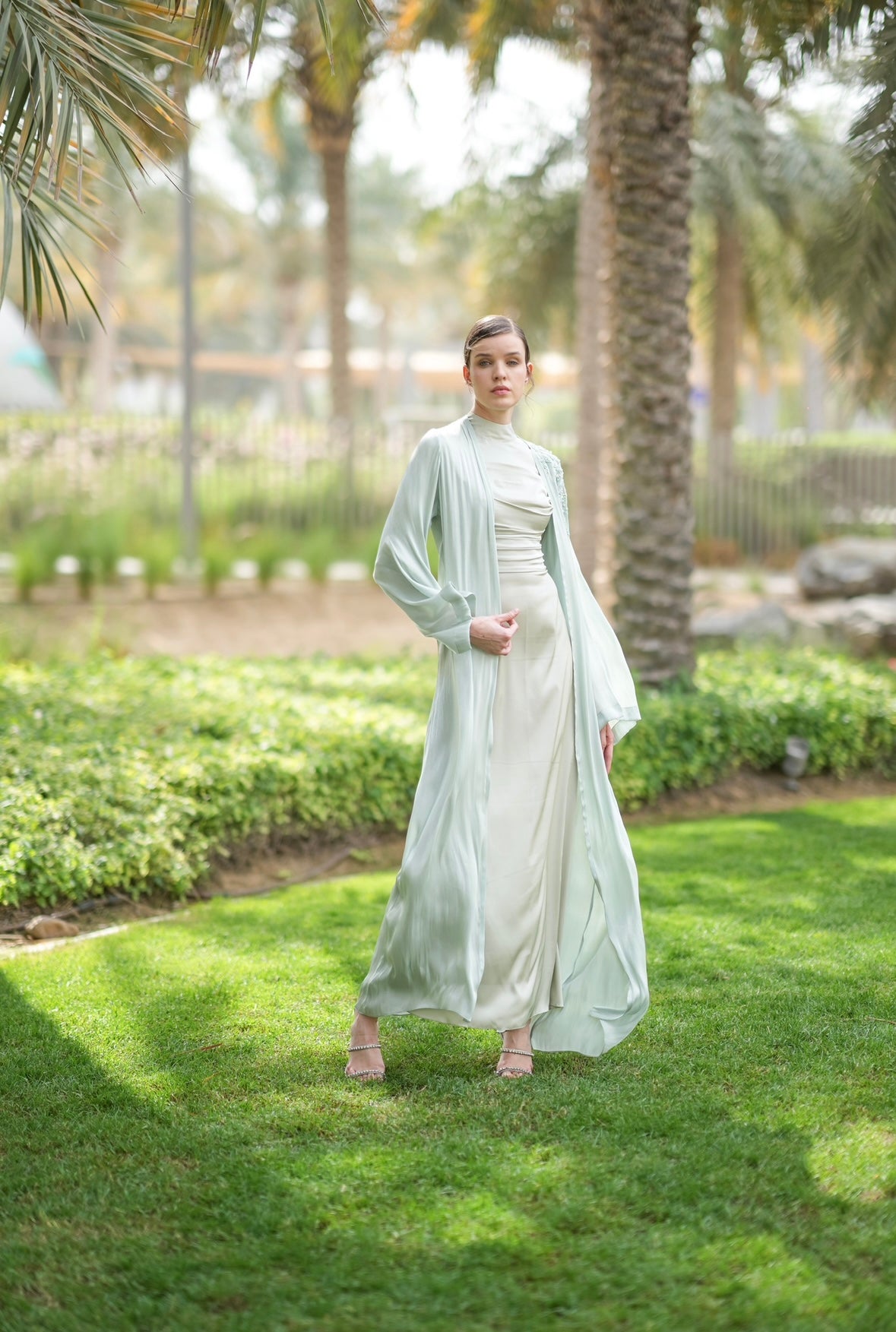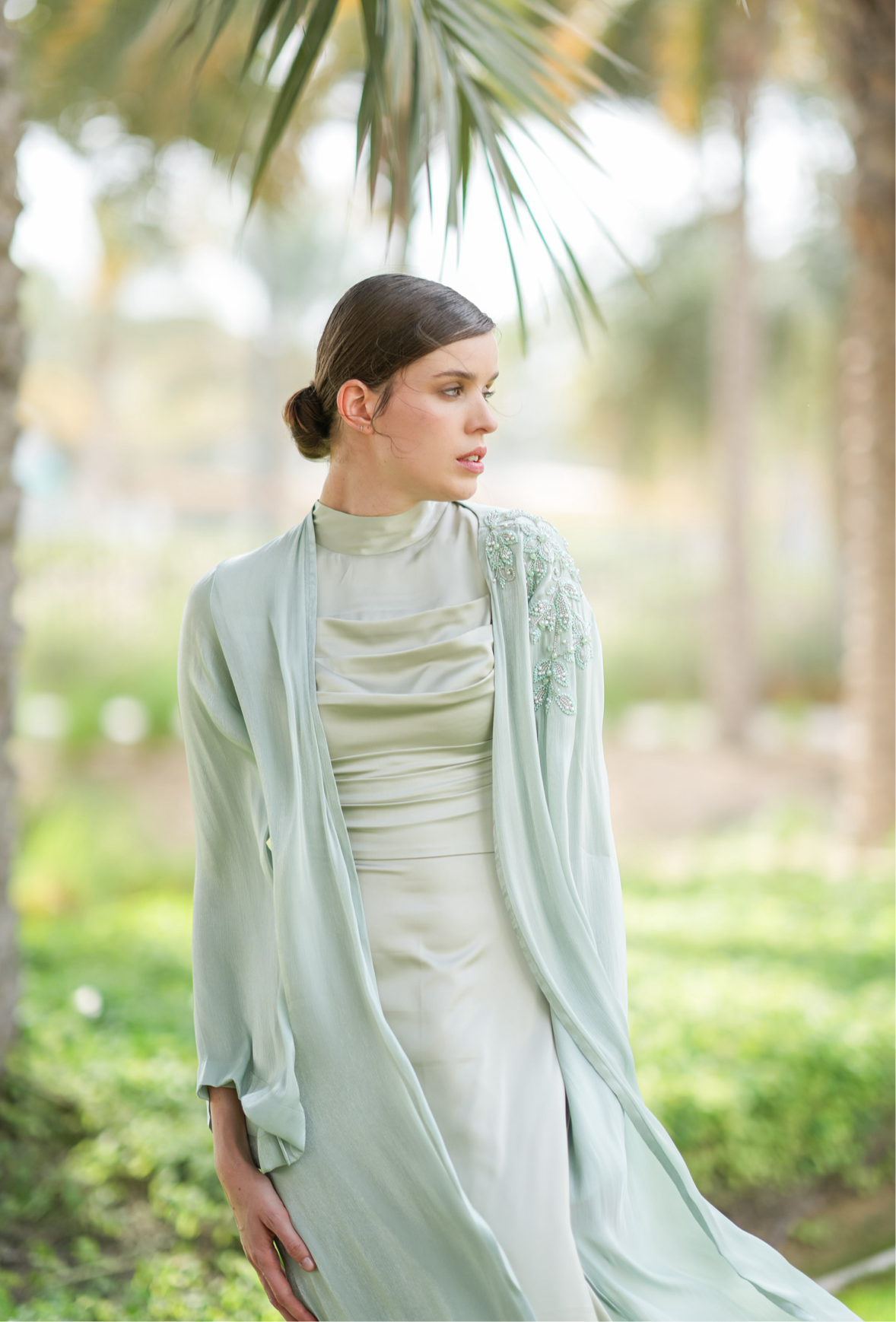 Our luxurious Bellamy Abaya features an elegant one-shoulder design, adorned with exquisite beadwork that adds a touch of sophistication. Crafted from chiffon organza, it drapes beautifully for a refined and graceful look. It comes with a matching inner dress and scarf for a complete look.