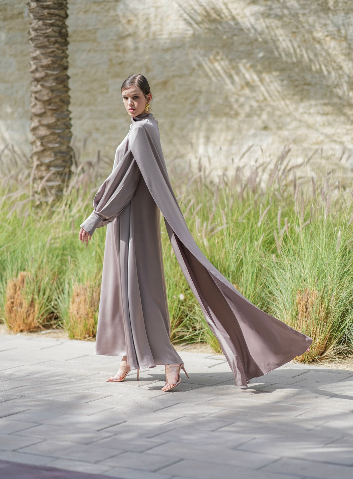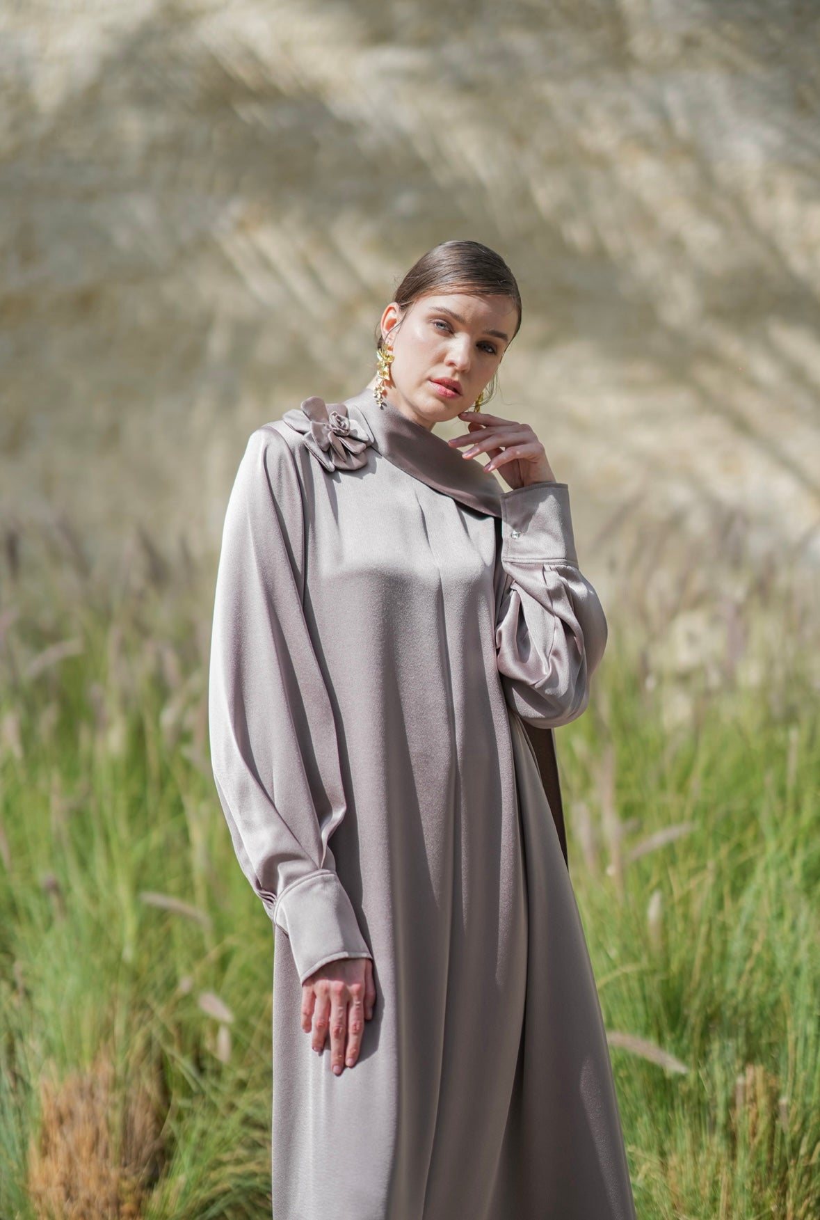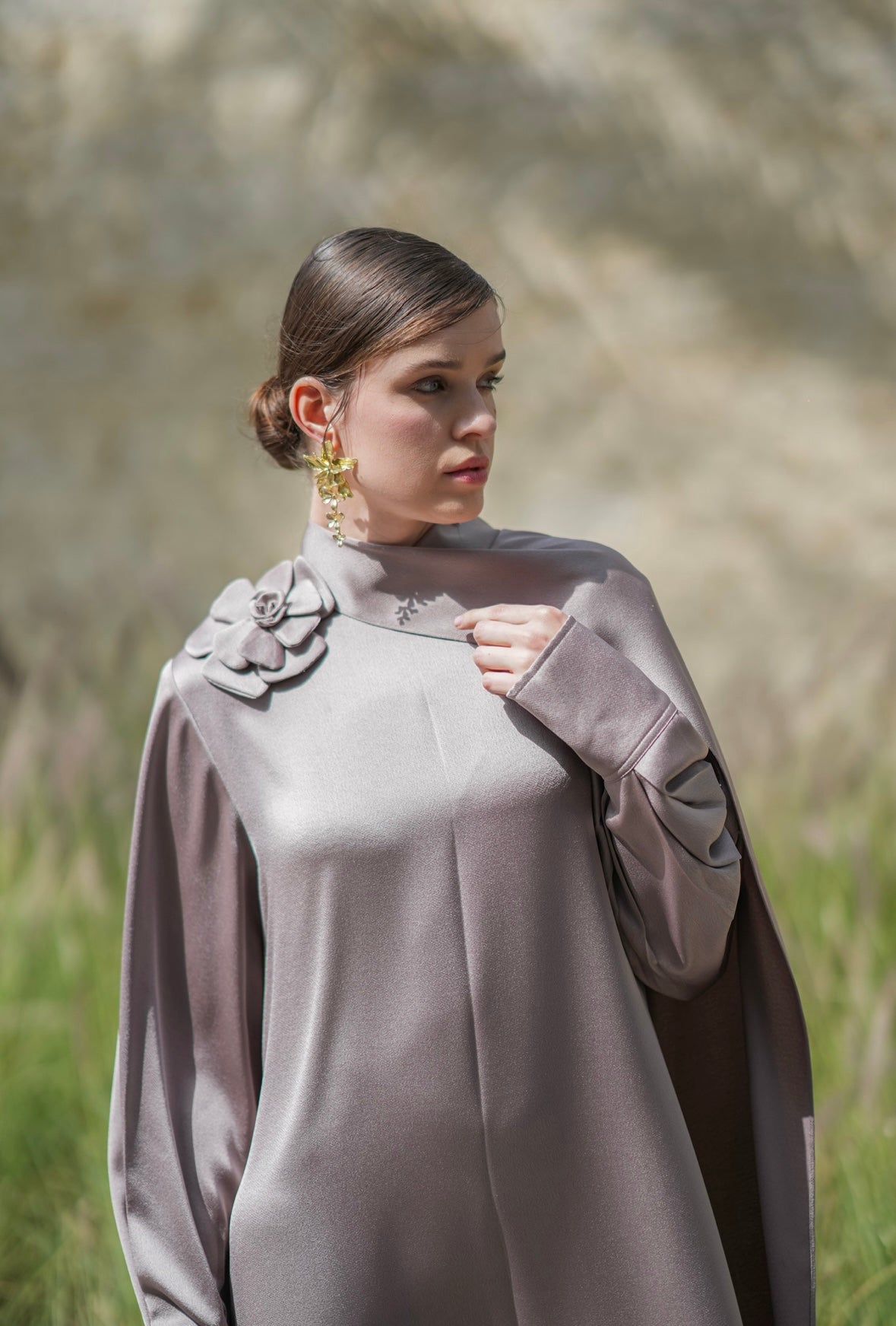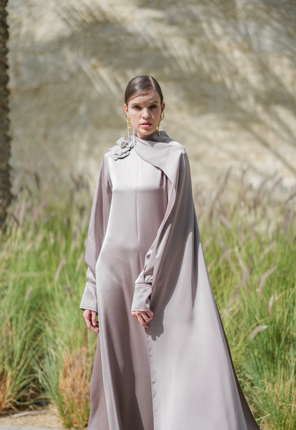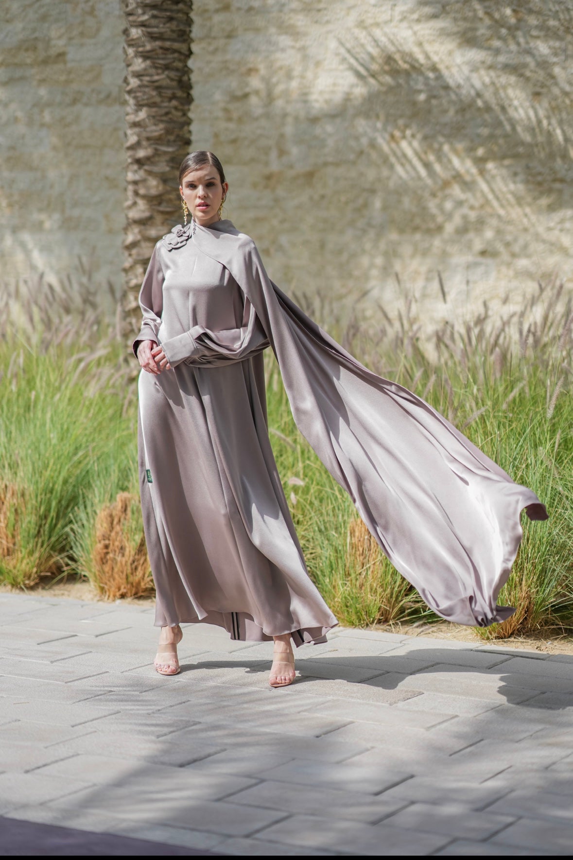 Our exquisite Hazel Dress radiates luxury with its breathtaking custom floral detailing and a gracefully flowing long cape, embodying elegance in every stitch. It comes with a matching inner dress and scarf for a complete look.