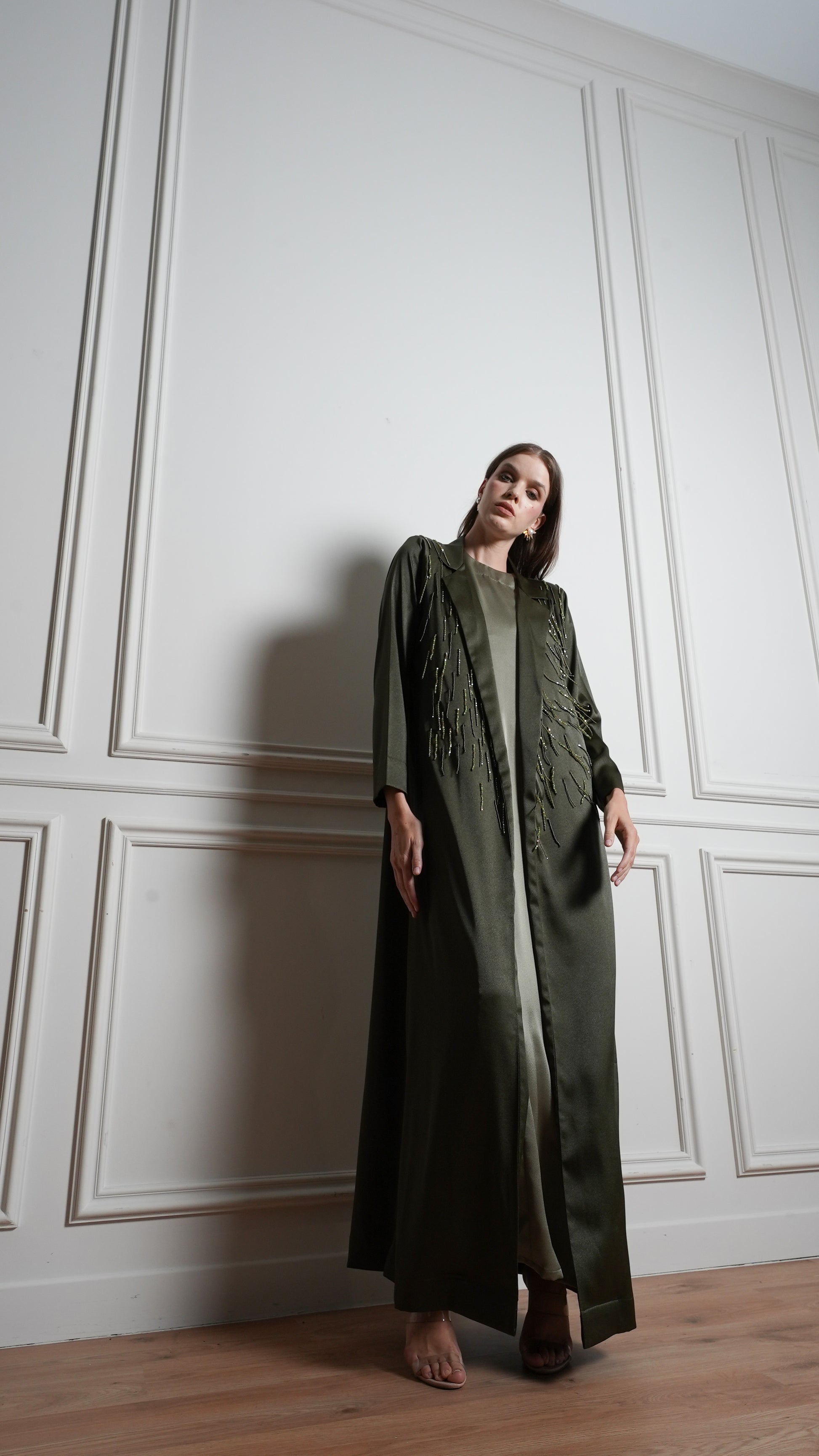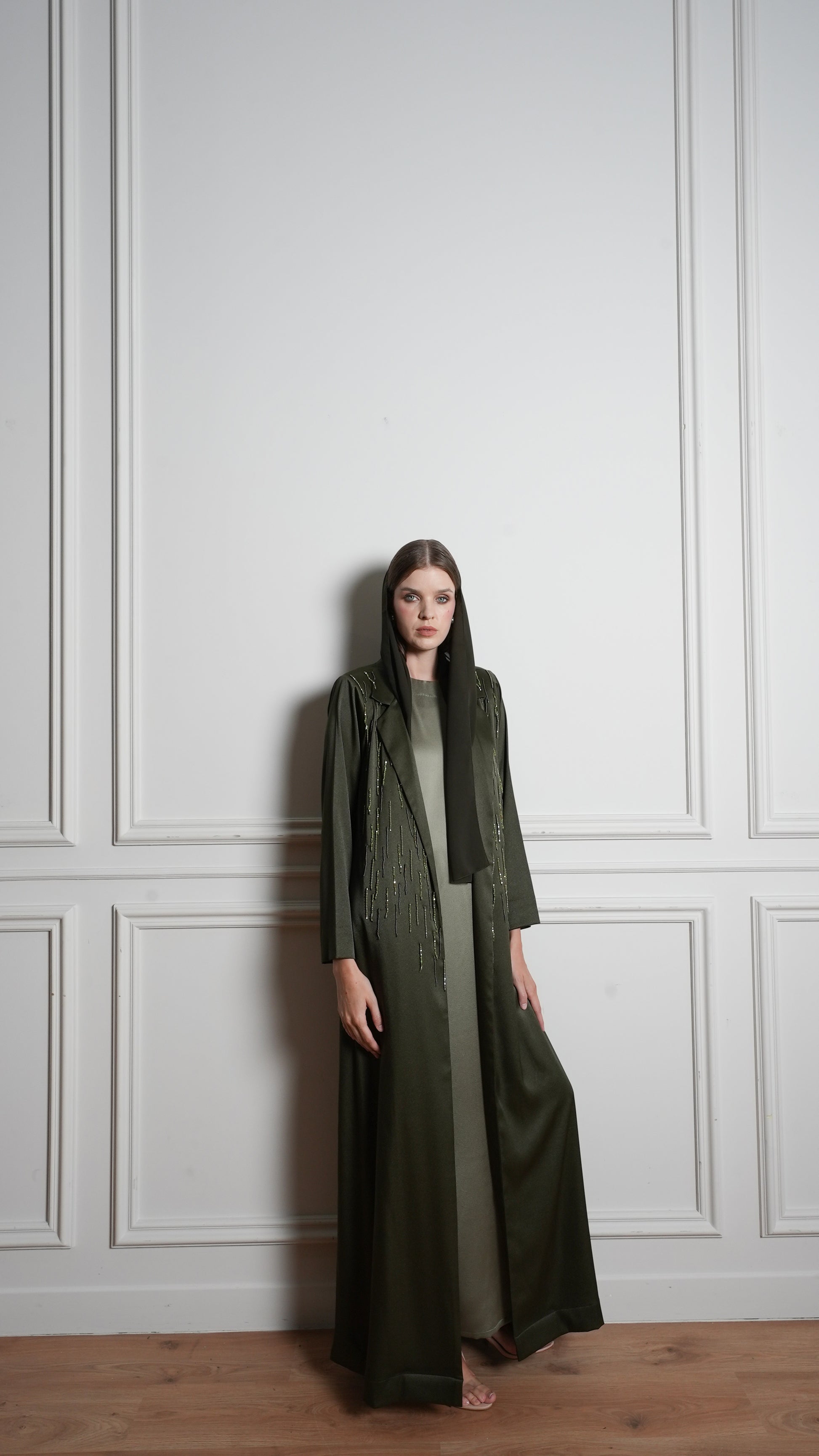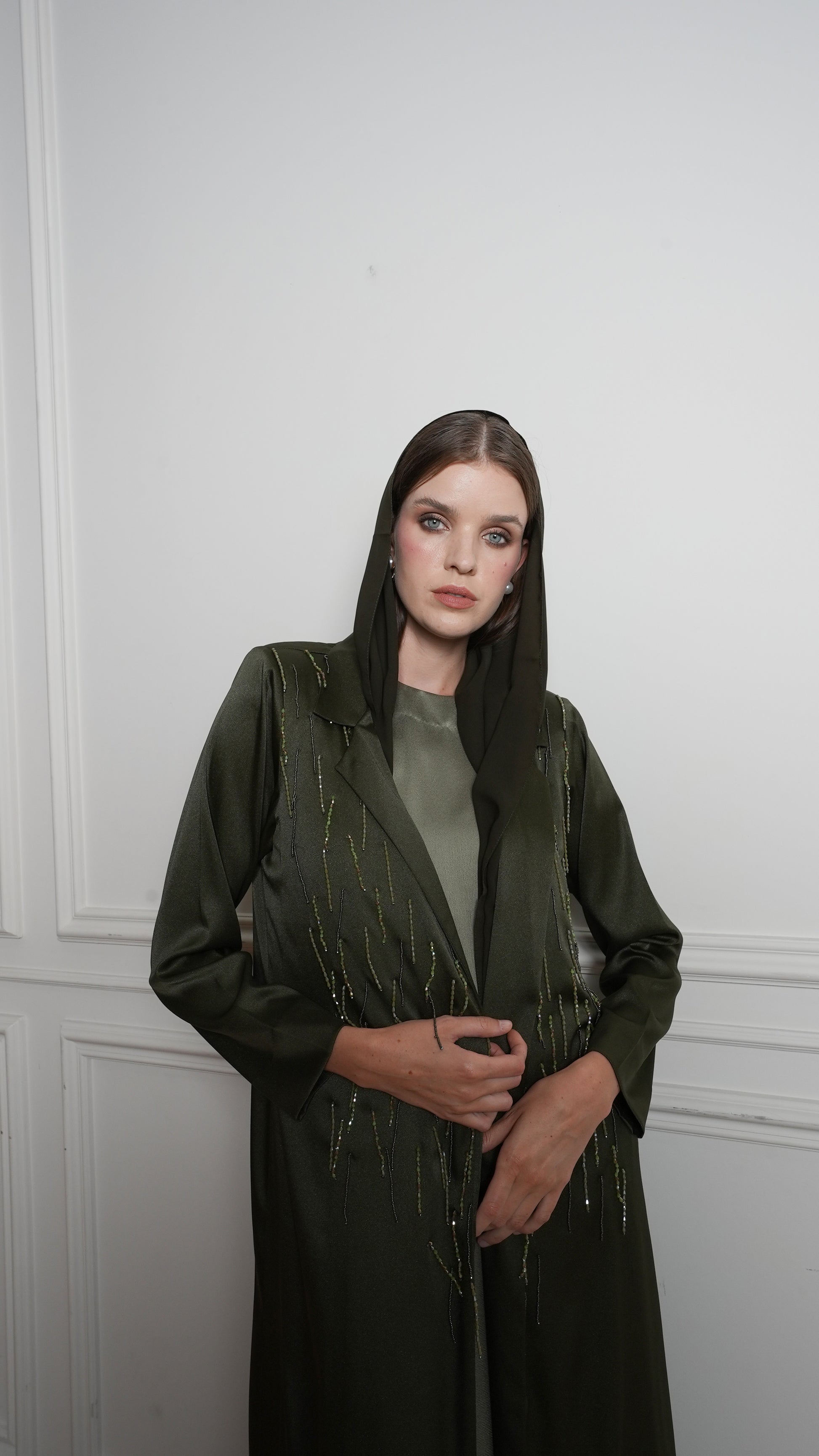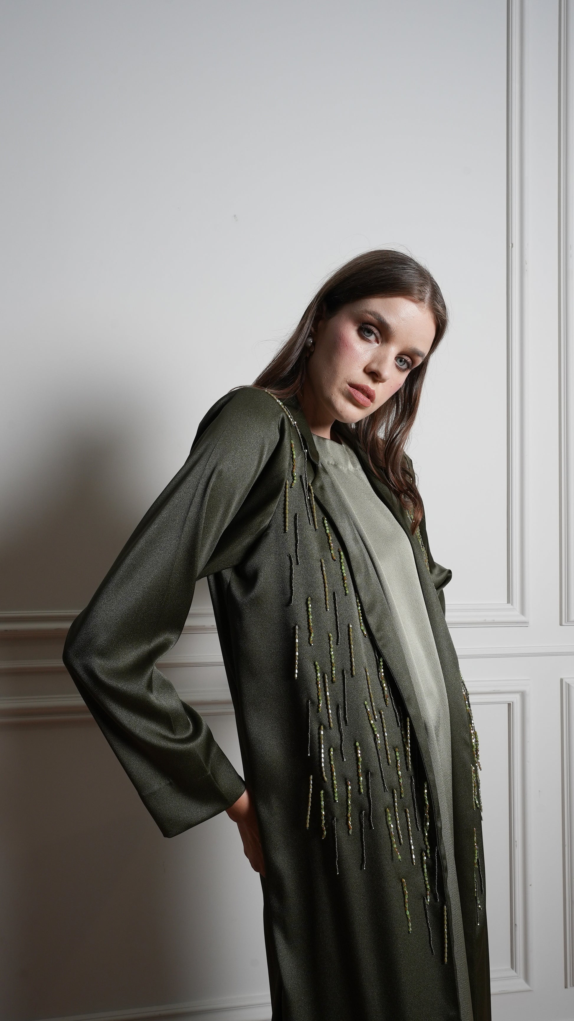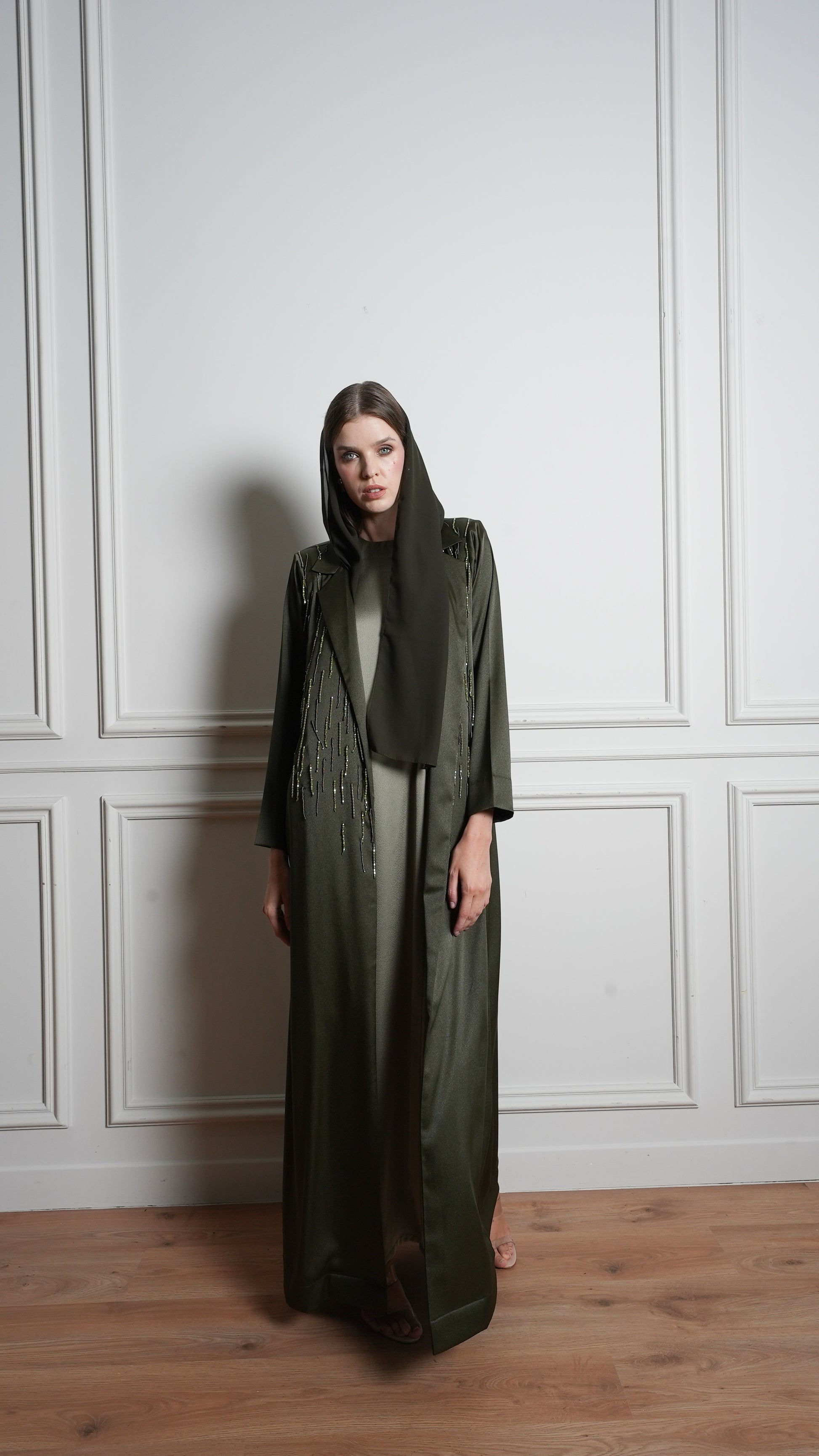 Our beautiful Jana abaya showcases exquisite front beadwork that cascades like delicate droplets, adding graceful charm to every movement. It comes with a matching inner dress and scarf for a complete look.